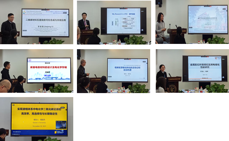 随后,青年学者代表从氢能和储能技术、资源碳中和技术和二氧化碳捕集利用技术等方向,基于自己的科研工作和研究成果进行了精彩的学术报告。沙特阿拉伯阿卜杜拉国王科技大学李加强博士后、英国德蒙福特大学田原教授、瑞士苏黎世联邦理工学院崔璨博士后、浙江大学王灿沛博士后分别以“二维碳材料石墨炔的可控合成与关键应用”“低碳和储能技术概述和进展”“碳中和能源系统的可持续转型”“碳基电极材料的设计及电化学存储”为题作了报告;新加坡国立大学韩沛杰博士后、杨琴博士后先后就“低碳能源催化转化的活性位和反应机理”“金属配位环境调控及其电催化性能研究”进行了分享;加拿大女王大学高国芮博士分享了在“液相系统中高效率、选择性和稳定性的电化学二氧化碳还原”科研工作中成果和经验。随后,大家针对报告中感兴趣的方向和内容展开深入充分地交流讨论。下午,学者们和学院团队之间进一步开展学术交流及参观实验室等活动。