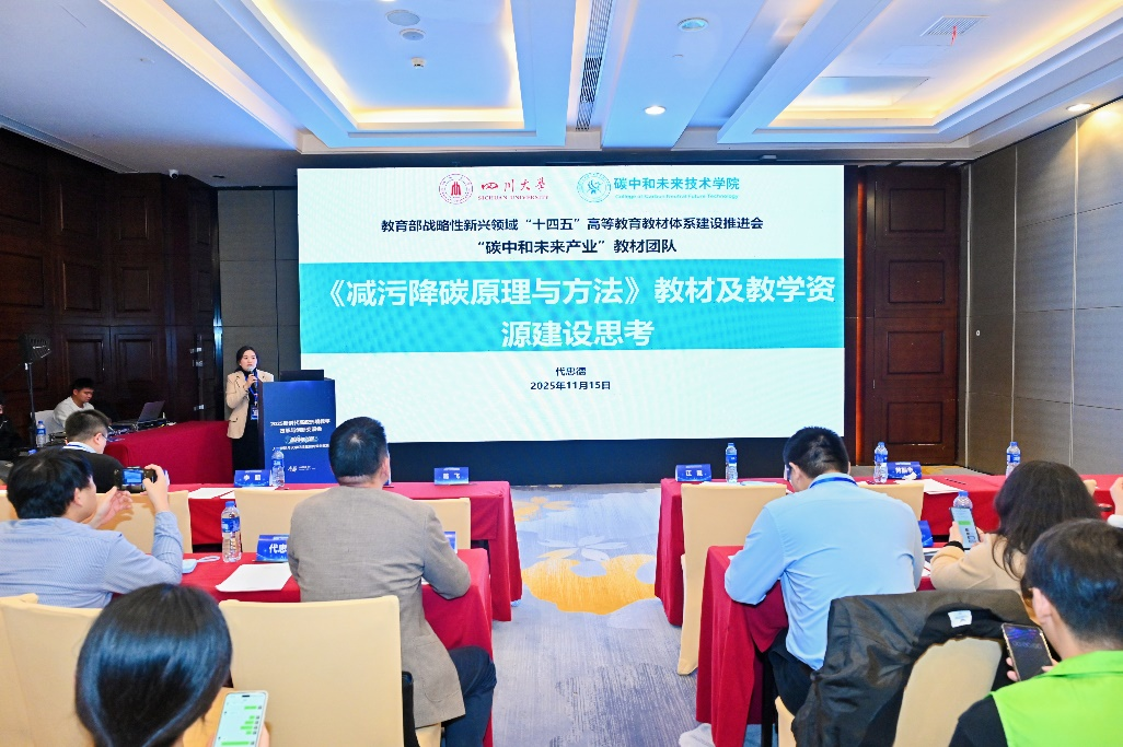 在碳中和学科建设、人才培养及平台建设等方面的创新举措和实践经验。学院姚露副研究员围绕“《减污降碳原理与方法》教材及教学资源建设思考”进行分享,重点阐述了该教材的编写背景、思路与内容,以及配套教学资源的建设等多方面的成果。