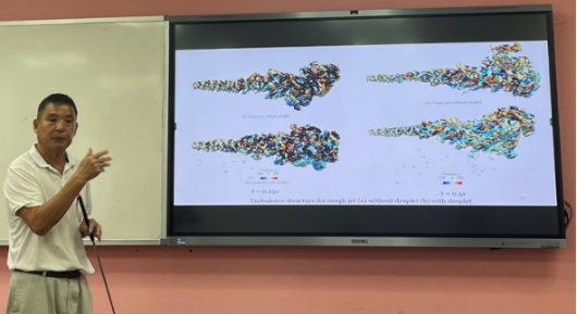 李少凡教授以“人咳嗽射流发展及呼气液滴分散的多相大涡模拟”为题作报告,介绍了其团队在计算力学和物理学前沿领域的主要研究工作。着重介绍大规模(bbb20亿颗粒)多相SPH湍流计算,模拟了人类咳嗽射流的真实尺寸和实时发展以及呼气液滴的分散和气溶胶形成过程,并进一步研究了空气和液滴之间的耦合对咳嗽射流湍流结构和持续时间的影响。相关研究成果为模拟吸收液捕集CO2过程中的气液界面流动提供了新思路,为降碳减排技术开发提供了宝贵的科学指引。